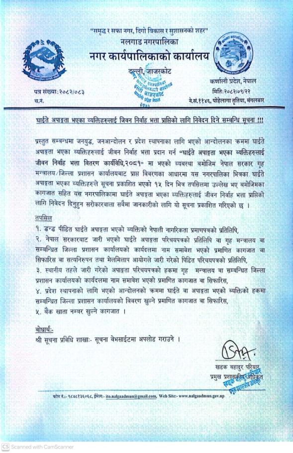 घाईते अपाङ्गता भएका व्यक्तिहरुलाई जिवन निर्वाह भत्ता प्राप्तिको लागि निवेदन दिने सम्बन्धि सूचना !!!
