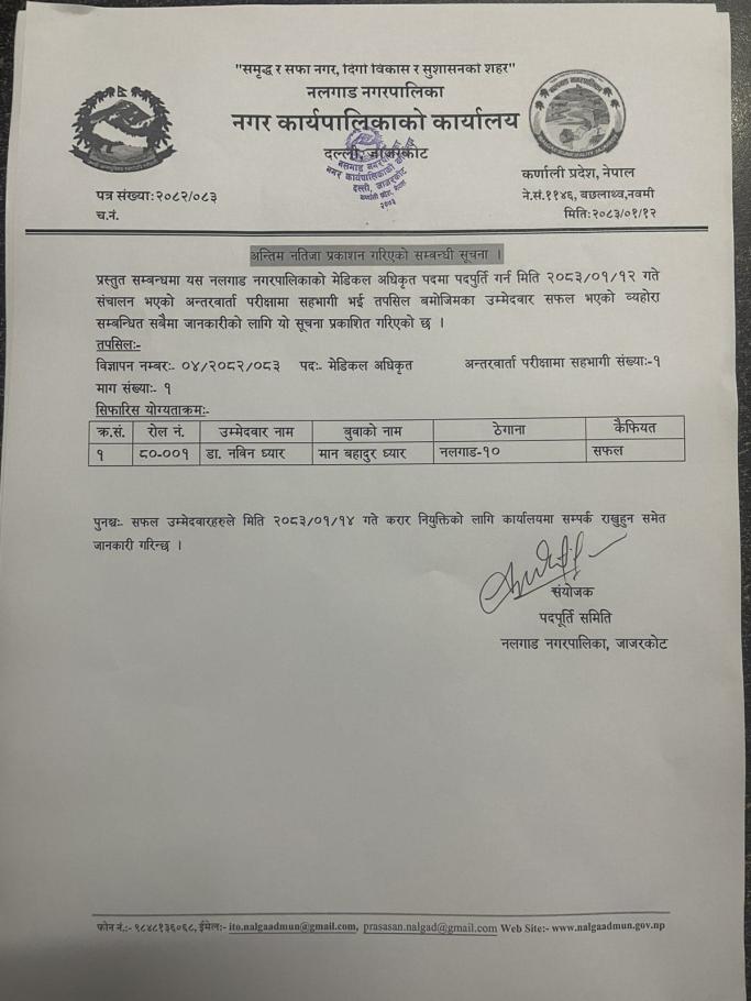 नतिजा प्रकाशन गरिएको सम्बन्धी सूचना (मेडिकल अधिकृत)