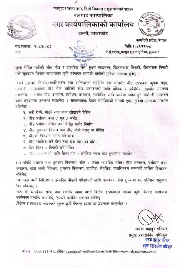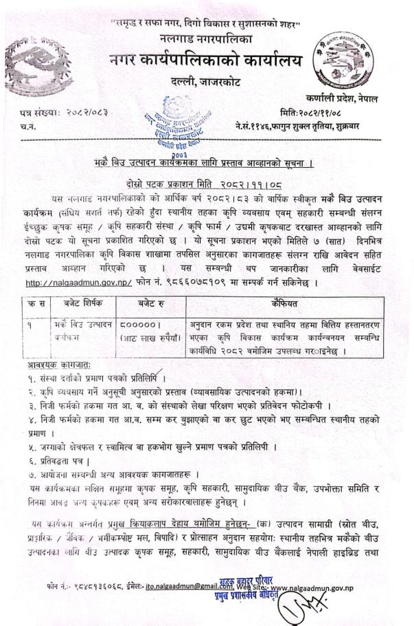 मकै बिउ उत्पादन कार्यक्रमका लागि प्रस्ताव आव्हानको सूचना ।